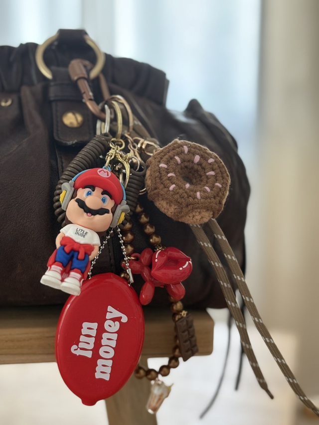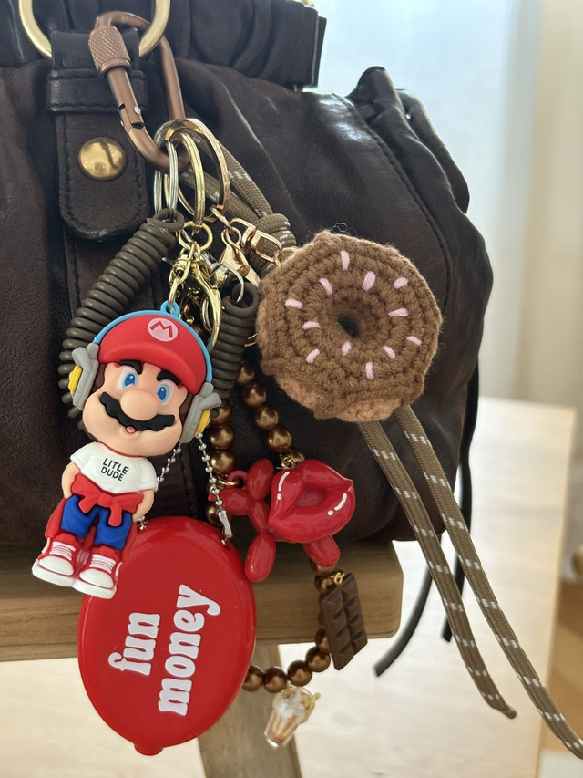 Ce bijou de sac est composé d’un personnage Mario Bros au look ultra tendance main dans les poches, il est cool ce Mario. Accompagné d’un porte-clés porte-monnaie rouge avec son inscription, fun Money, il a toujours des petites pièces, il aime pas les cb. Un donuts en crochet marron gout choco, il adore le chocolat sous toute ces formes. D’un cordon marron Clair, d’un porte-clés spirale marron et bien évidemment de son bijou, Perline avec ses cinq perlinettes ou tu peux voir un ourson en chocolat, une tablette de chocolat et un milk shake gout choco. Le tout accroché à un mousqueton marron, la couleur du chocolat, je crois qu’il est fan de Cédric Grolet, je les croisé à la boutique «Cédric et la chocolaterie » 33 avenue de l’opéra.