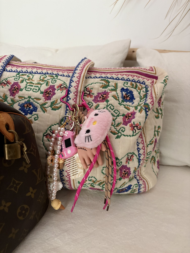 Un bijou de sac sacré avec une mini livre, une peluche kitty, des perles et un porte-clés. Un mélange unique entre spiritualité et kawaii !