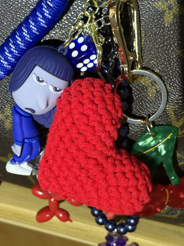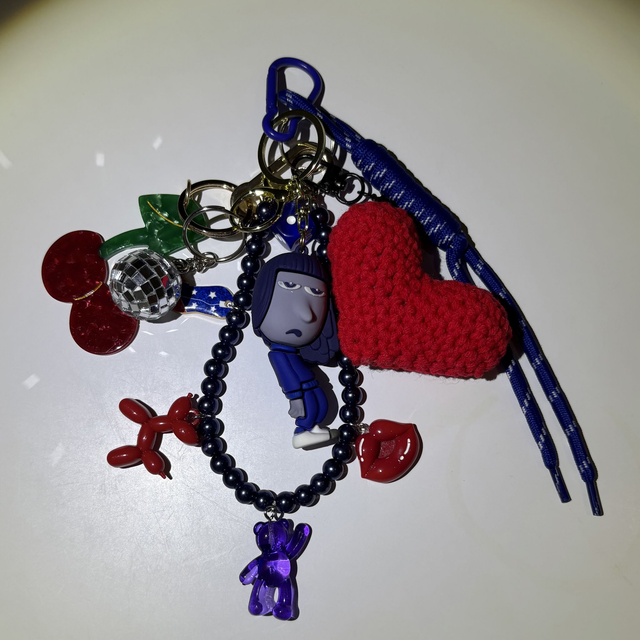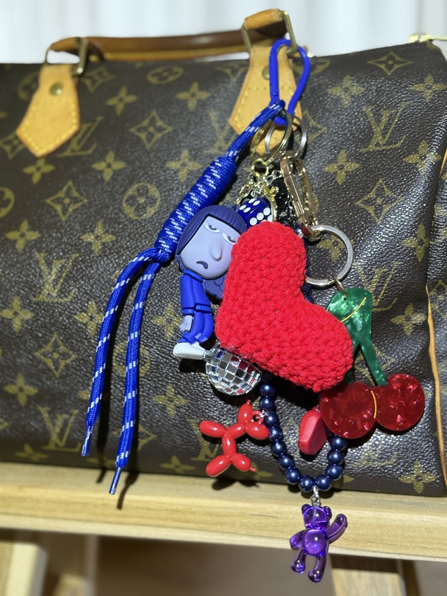 Pour lui donner goût à la vie, Tu y retrouves un coeur pour l’amour, tu ne t’ennuies pas avec ton amour enfin je crois lol. Une boule à facette on ne s’ennuie pas si on fait la fête, aimez vous comme vous êtes et la vie sera toujours une fête. Et quoi de mieux pour la fête que le Pacha à Ibiza d’où les cerises, fiesta. Un cordon bleu marine et le petit bijou perline et ses pertinettes pour le glamourous. Un mousqueton bleu pour soutenir tout se condensé de distraction. Avec se bijou ton sac sera enivrant.