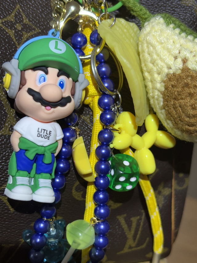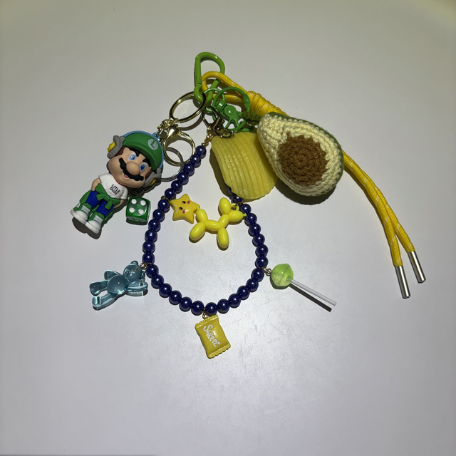On y retrouve un adorable Luigi qui adore les avocado toast d’ou le porte clés en crochet avocat mais il aime aussi la junk food, on peut voir un porte clés chips ondulé, il aime se faire plaisir, un paquet de chips ça va pas nous faire de mal de temps en temps. Un cordon jaune comme le soleil vitamine D, oblige pour la bonne humeur. Un porte clé dé vert il adore le casino , un petit souvenir du casino de Cassis dans le sud de la France. Sans oublier un bijou Perline pour le style avec ses cinq perlinettes de ses choses préférés c’est un nostalgique il adore les friandises, les caniches, son doudou et la super étoile Mario Game.