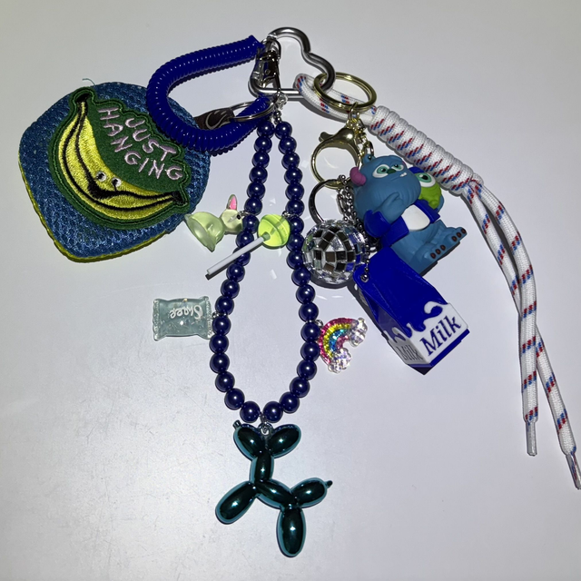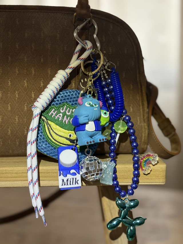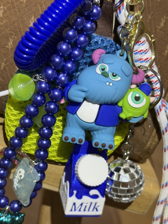 On y retrouve un adorable Sully et son acolyte Bob tout petit. Une mini brique de lait pour des os solide de champion de la terreur. Une boule disco argentée ce sont des futurs fêtards . Une pochette pour AirPods méga fun avec une banane souriante brodée, on adore tous écouter de la bonne musique ou un bon podcast de Lena situation ou ce que tu veux en faite. Un porte clé étirable bleu, SO 80,s. Un bijou perline et ses cinq perlinettes, des détails craquants viennent compléter ce bijou.