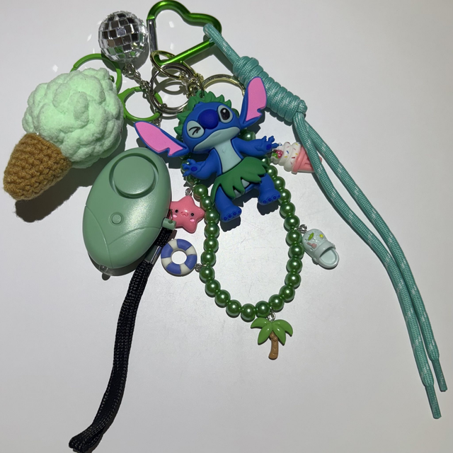 Un porte clé alarme et lampe de poche vert pour éloigner les extraterrestre AhAh ah! D’une boule disco parce qu’on aime faire la fête.